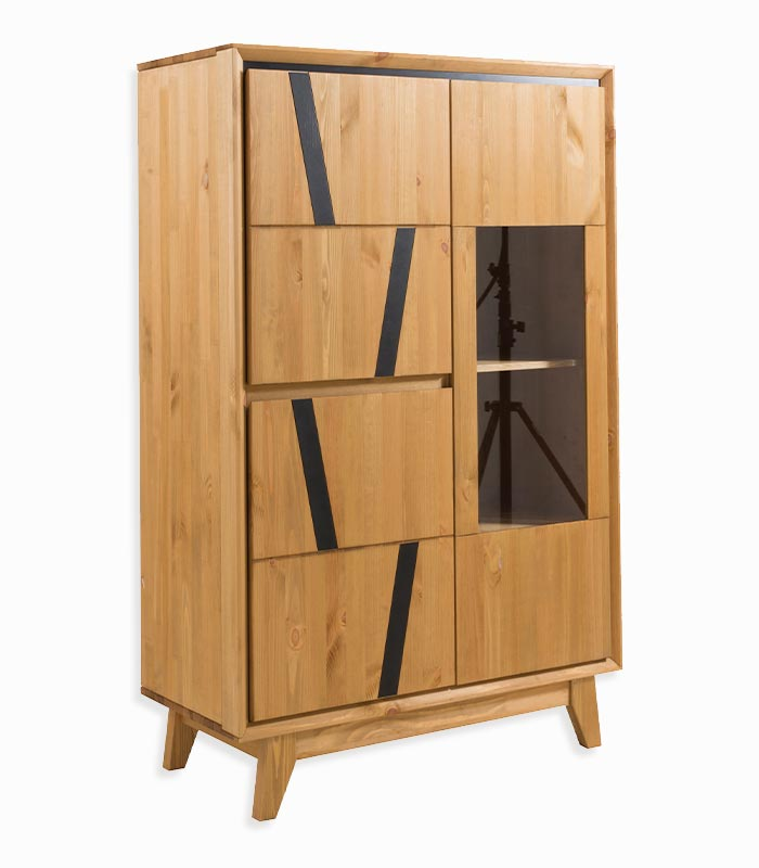 Мебель «Мэнсон» от фабрики «Санреми» выполнена в стиле «лофт» и сочетает в себе элементы металла. Она покрыта бейцем цвета антик и маслом, что придаёт изделиям благородный винтажный оттенок и защищает их от внешних воздействий. В коллекцию входят шкаф для посуды, тумбы с разным количеством дверей, тумбы для ТВ и журнальный стол. Все предметы мебели изготовлены из массива сосны и отличаются вместительностью, функциональностью и современным дизайном. Шкаф для посуды 21 Мэнсон: 3 распашные дверки, за высокой дверью 3 полки, за дверками с элементами из металла по одной полке.