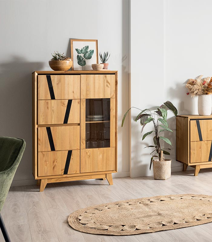 В коллекцию входят шкаф для посуды, тумбы с разным количеством дверей, тумбы для ТВ и журнальный стол. Все предметы мебели изготовлены из массива сосны и отличаются вместительностью, функциональностью и современным дизайном. Шкаф для посуды 21 Мэнсон: 3 распашные дверки, за высокой дверью 3 полки, за дверками с элементами из металла по одной полке.
