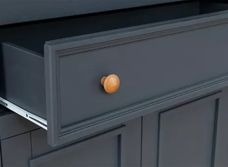 2. Для выдвижных ящиков используется система роликовых и шариковых направляющих фирмы Хёфеле. Выдвижной ящик на роликовых направляющих, две глухих и две стеклянных дверки, за стеклянными дверками две деревянные полки, за глухими дверками одна деревянная полка.