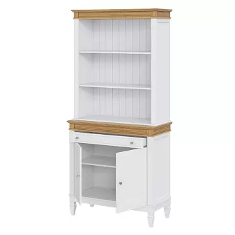 Буфет выполнен из массива сосны. Удобный и вместительный, очень прост, но при этом функционален. Отлично впишется как в обеденную так и в гостиную. Буфет укомплектован двумя полками сверху, одной полкой снизу за распашными дверями и одним ящиком.