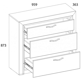 Комод 3S OLIVIA – необходимый предмет мебели для организации интерьера спальни и молодёжной комнаты. Является функциональным и прекрасным дополнением в обыгрывании с другими модулями коллекции OLIVIA, так как глубина элемента – 360 мм (возможно оформление туалетного стола с зеркалом (ширина 960 мм)). Комод 3S имеет прямую конструкцию. Конструкция элемента представляет собой три выдвижных ящика (3S), расположенных друг над другом, для хранения белья и предметов одежды (верхний ящик неглубокий, средний и нижний ящики – глубокие).