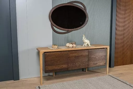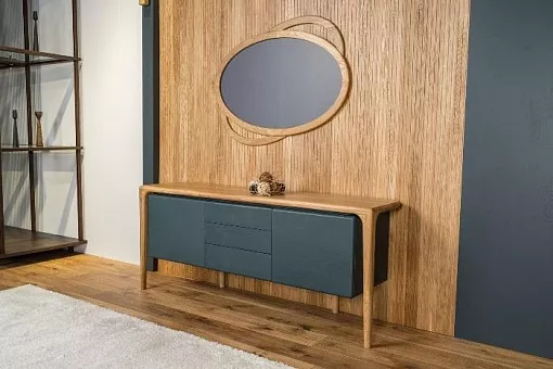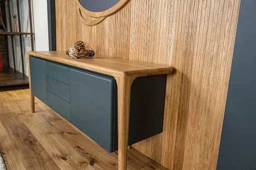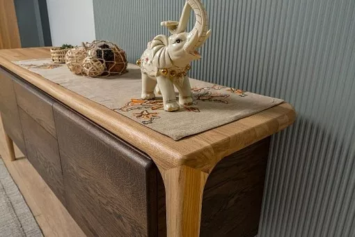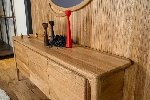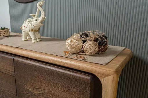 Мебель изготовлена из 100% массива дуба. В дизайне применяются интегрированные формы, рельефные фасады с