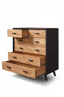Комод выполнен из массива сосны. Имеет 4 больших и 2 малых выдвижных ящиков. Высота ножек 15 см. Все выдвижные ящики серии Эрика на шариковых направляющих,двери - европетли , по-умолчанию металлические ручки, возможно изготовление без отверстий, черным цветом - нанесён чёрный матовый лак. Задние стенки и донышки ящичков - наборная вагонка, сосна. Тон мебели может отличатся от фотографии на сайте.