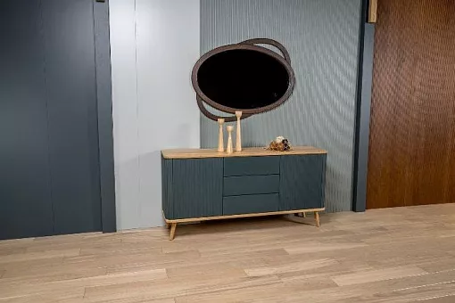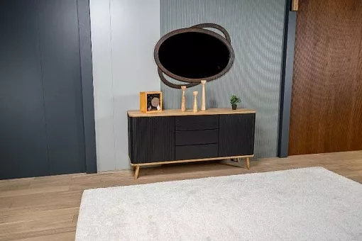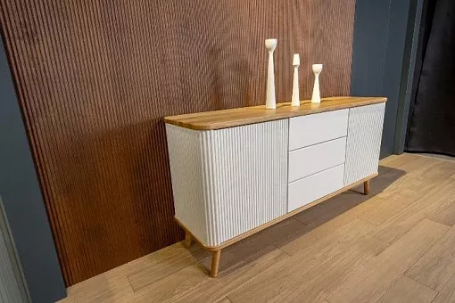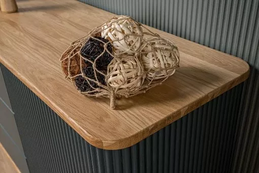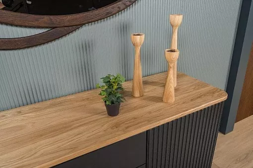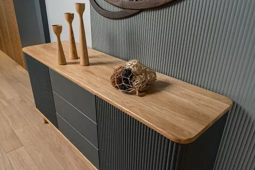 Мебель изготовлена из 100% массива дуба. В дизайне применяются интегрированные формы, рельефные фасады с