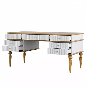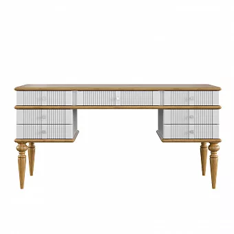 Классический письменный стол из коллекции “Рандеву” для поклонников светлых интерьеров. Широкая удобная столешница подойдет для работы за компьютером. Под ней расположено семь выдвижных ящиков для канцтоваров, документов и разных мелочей. Все детали сделаны из натурального массива дерева, что обеспечивает их прочность и надежность. Отличное приобретение для личного кабинета, гостиной или спальни. Широкая столешница удобна как для работы за компьютером, так и для рисования и другого ручного труда.Фотографии могут не передавать точный цвет изделия.