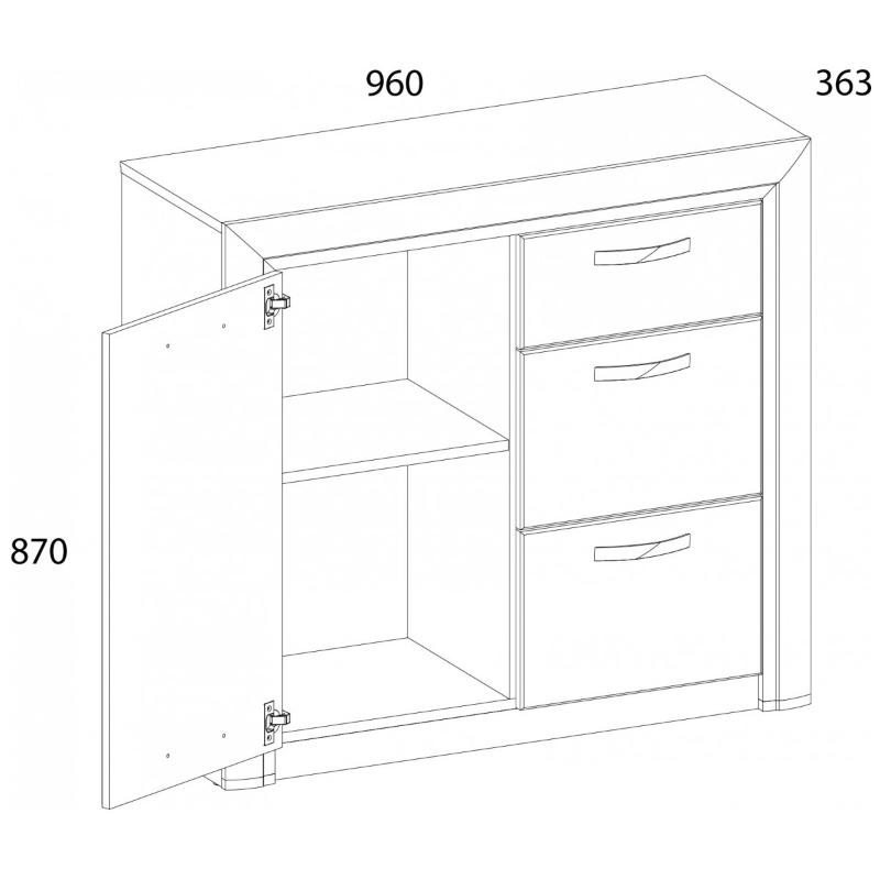 Тумба 1D3S OLIVIA – универсальный предмет мебели, который может быть установлен в любой по функционалу комнате, даже с небольшой площадью – ширина элемента 960 мм (сравнение с тумбой Оливия 2D3S). Тумба 1D3S имеет прямую конструкцию. Конструкция элемента представляет собой одно отделение с полкой из ЛДСП за глухой дверью (1D), три выдвижных ящика (3S) (верхний ящик неглубокий, средний и нижний ящики – глубокие). Дверь распашная, крепится на петли к боковому корпусу изделия.