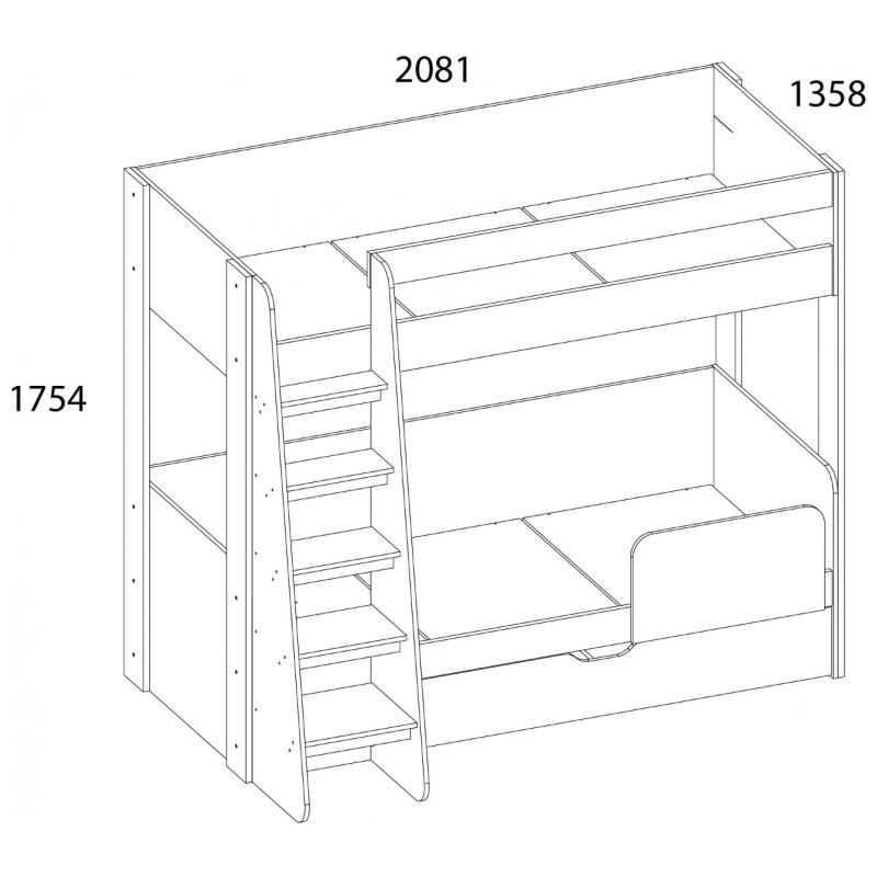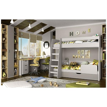 Кровать двухъярусная MODERN оптимальное решение организации зоны отдыха и сна для двух персон в детской комнате, если нет возможности установить две отдельные стоящие кровати. Конструкция кровати двухъярусной MODERN представляет два спальных яруса, выдвижной ящик в нижнем ярусе, основания – щиты ЛДСП, лестница – доступ к верхнему ярусу, бортик защитный. Особенностью элемента являются практичность, сохранение полезной площади для организации игровой или учебной зоны, стильность и комфорт.