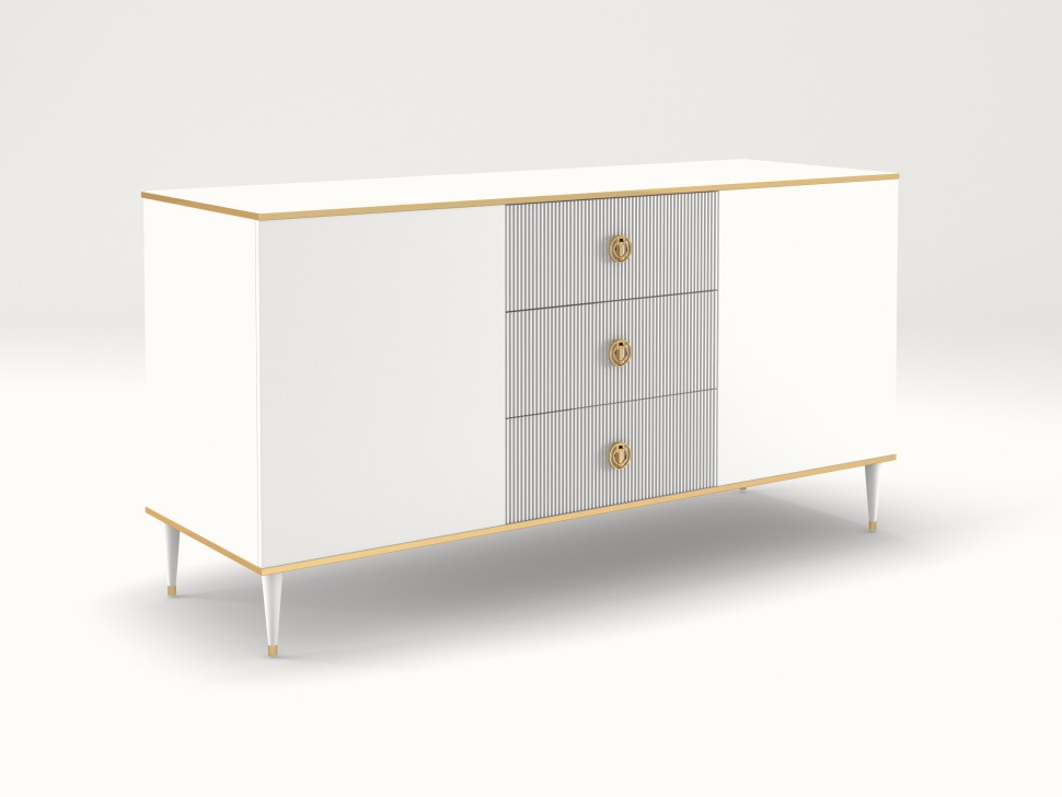 Комод для гостиной Глория выполнен из МДФ, в современном стиле. Крашения M11 (белый) и M18 (ваниль) с золотой или серебрянной патиной, но если патина серебро, то ручки только заказные за доплату. Шариковые направляющие BOYARD полного выдвижения, ящики из фанеры в лаке прозрачном. Дополнительно возможна установка с доводчиками. Ручки металлические. Возможно изготовление в нестандартном размере, подробности уточняйте у менеджеров.