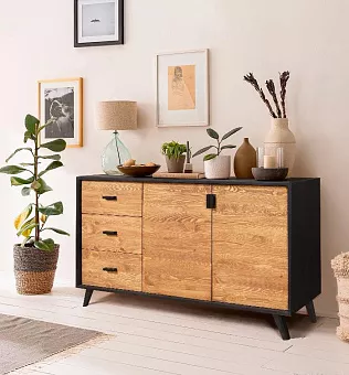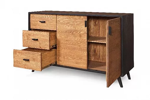 Комод выполнен из массива сосны. Имеет 2 распашные двери, 3 ящика. Высота ножек 15 см. Все выдвижные ящики серии Эрика на шариковых направляющих,двери - европетли , по-умолчанию металлические ручки, возможно изготовление без отверстий, черным цветом - нанесён чёрный матовый лак. Задние стенки и донышки ящичков - наборная вагонка, сосна. Тон мебели может отличатся от фотографии на сайте.