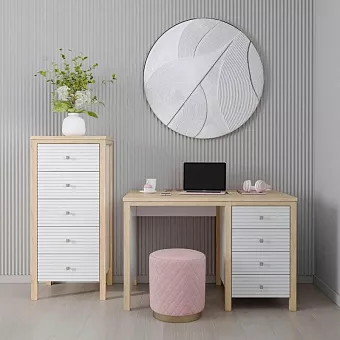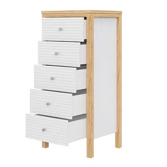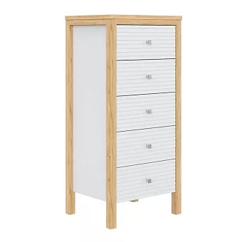 Комод оснащен пятью выдвижными ящиками. Фурнитура на ящиках с доводчиками. Высокие ножки обеспечивают оптимальный доступ при уборке.