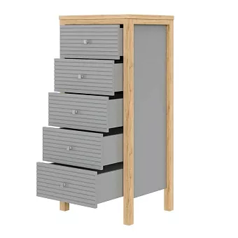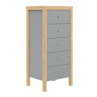 Комод оснащен пятью выдвижными ящиками. Фурнитура на ящиках с доводчиками. Высокие ножки обеспечивают оптимальный доступ при уборке.
