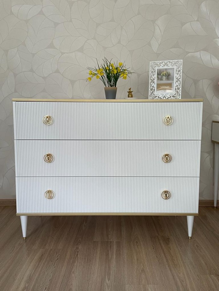 Комод Глория 3 ящика выполнен из МДФ, в современном стиле. Крашения M11 (белый) и M18 (ваниль) с золотой или серебрянной патиной, но если патина серебро, то ручки только заказные за доплату. Шариковые направляющие BOYARD полного выдвижения, ящики из фанеры в лаке прозрачном. Дополнительно возможна установка с доводчиками. Ручки металлические. Возможно изготовление в нестандартном размере, подробности уточняйте у менеджеров.