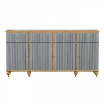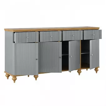 Комод оснащен четырьмя распашными дверками с полками внутри и четырьмя ящиками. Фурнитура на дверях и ящиках с доводчиками. Высокие ножки обеспечивают оптимальный доступ при уборке.