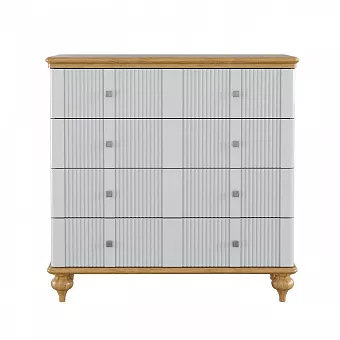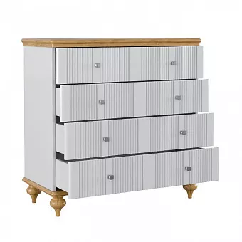 Комод оснащен четырьмя широкими ящиками. Фурнитура на ящиках с доводчиками. Высокие ножки обеспечивают оптимальный доступ при уборке.