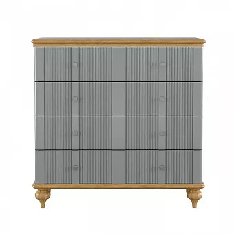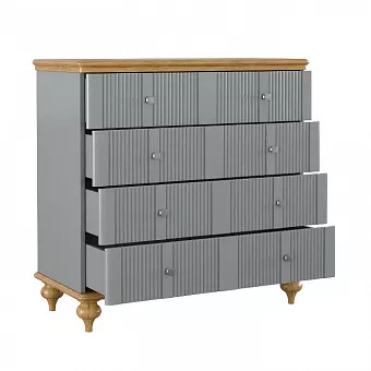Комод оснащен четырьмя широкими ящиками. Фурнитура на ящиках с доводчиками. Высокие ножки обеспечивают оптимальный доступ при уборке.