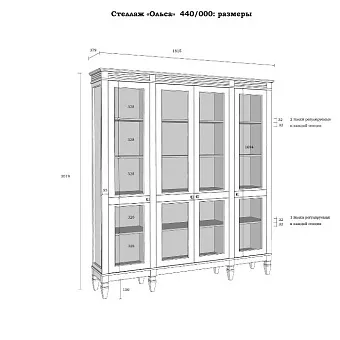 Большой и вместительный стеллаж “Ольса” - находка для просторной гостиной, библиотеки или кабинета. Здесь вы сможете разместить не только любимые книги, но и посуду и другие нужные вещи. Визуально разделен на три вертикальных секции, в каждой из которых четыре полки. Оснащен четырьмя стеклянными распашными дверями. Сделан из натурального массива, поэтому может выдерживать значительные нагрузки. Вес изделия 120,5 кг.