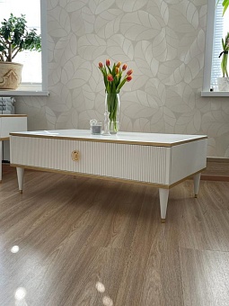 Журнальный стол Глория выполнен из МДФ, в современном стиле. Крашения M11 (белый) и M18 (ваниль) с золотой или серебрянной патиной, но если патина серебро, то ручки только заказные за доплату. Шариковые направляющие BOYARD полного выдвижения, ящики из фанеры в лаке прозрачном. Дополнительно возможна установка с доводчиками. Ручки металлические. Возможно изготовление в нестандартном размере, подробности уточняйте у менеджеров.