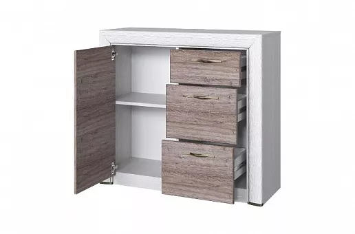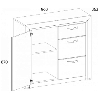 Тумба 1D3S OLIVIA – универсальный предмет мебели, который может быть установлен в любой по функционалу комнате, даже с небольшой площадью – ширина элемента 960 мм (сравнение с тумбой Оливия 2D3S). Тумба 1D3S имеет прямую конструкцию. Конструкция элемента представляет собой одно отделение с полкой из ЛДСП за глухой дверью (1D), три выдвижных ящика (3S) (верхний ящик неглубокий, средний и нижний ящики – глубокие). Дверь распашная, крепится на петли к боковому корпусу изделия.
