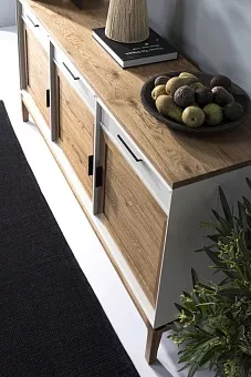 Серия мебели Гранада выполнена полностью из массива сосны. Современный стиль мебели идеально впишется в Ваш интерьер квартиры или загородного дома создавая уютную и стильную атмосферы. В коллекцию входит однодверные и двухдверные тумбы, шкафы для посуды с остеклением и без остекления. Корпуса, фасады и полки изготавливаются из массива сосны, задние стенки и днища ящиков из ДВП. На выбор два цветовых сочетания: «белый воск/антик 24» или «серый 7016/антик 24». Тумба 33 Гранада с 3 дверцами и 3 ящиками изготовлена из массива сосны – прочного и долговечного натурального материала. Задняя стенка сделана из ДВП.