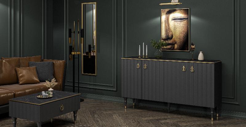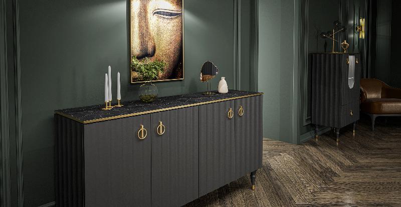 Коллекция мебели Лоренсо – это изысканный дизайн, подчеркнутый золотой металлической линией на изящной столешнице Мрамор Неро Маркина.