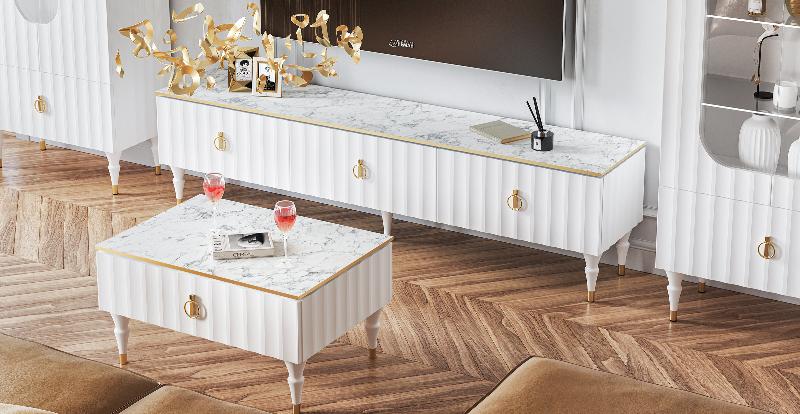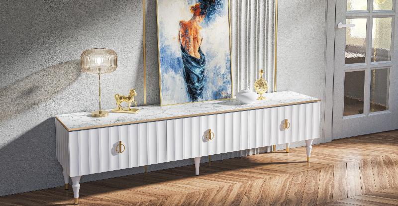 Коллекция мебели Лоренсо – это изысканный дизайн, подчеркнутый золотой металлической линией на изящной столешнице Мрамор Неро Маркина.