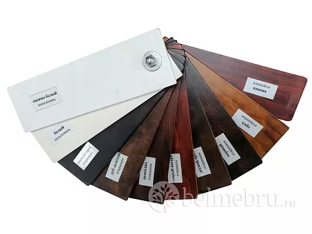 Основные цвета выполнены методом втирания красителя в древесину и последующим закреплением красителя и покрытия лаком. Цвета светлой палитры, а именно Белый и Снежно белый являются эмалями и текстура дерева не просматривается, цвет глухой ровный. Хотим обратить ваше внимание, что фото и цветопередача может различаться от просмотра в живую.