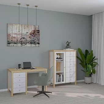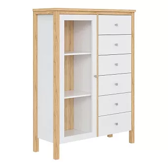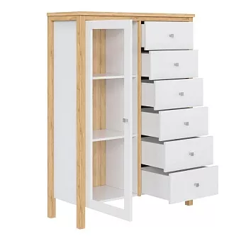Тумба (комод) оснащен шестью выдвижными ящиками и распашной, стеклянной дверкой с двумя полками. Фурнитура на ящиках и двери с доводчиками. Высокие ножки обеспечивают оптимальный доступ при уборке.