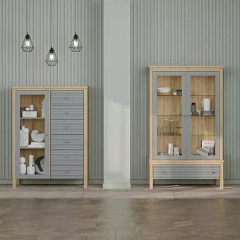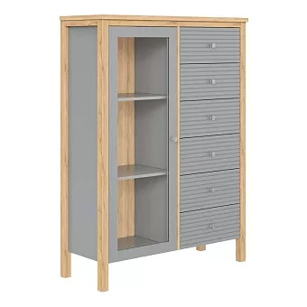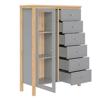 Тумба (комод) оснащен шестью выдвижными ящиками с горизонтальными прорезями и распашной, стеклянной дверкой с двумя полками. Фурнитура на ящиках и двери с доводчиками. Высокие ножки обеспечивают оптимальный доступ при уборке.