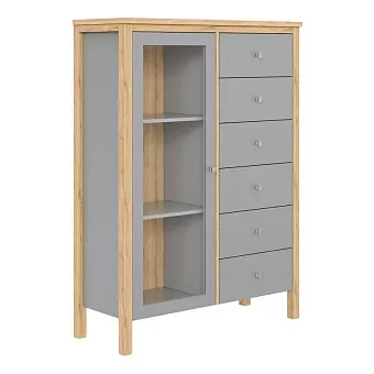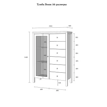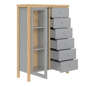 Тумба (комод) оснащен шестью выдвижными ящиками и распашной, стеклянной дверкой с двумя полками. Фурнитура на ящиках и двери с доводчиками. Высокие ножки обеспечивают оптимальный доступ при уборке.