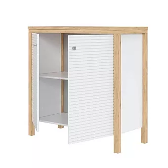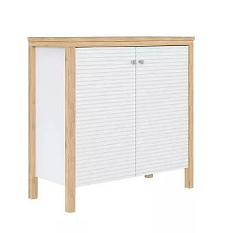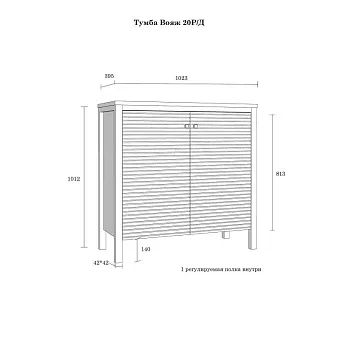 Тумба (комод) оснащен двумя распашными рифлеными дверками с одной полкой. Фурнитура на дверях с доводчиками. Высокие ножки обеспечивают оптимальный доступ при уборке.