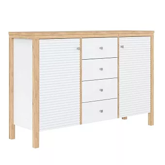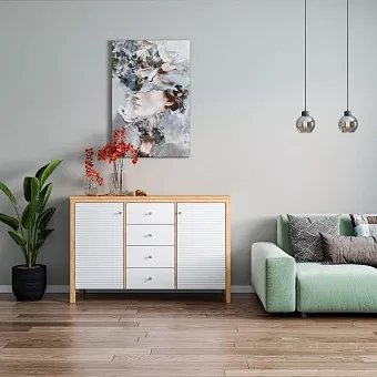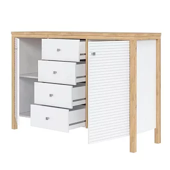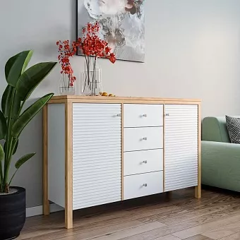 Тумба (комод) оснащен четырьмя выдвижными ящиками и двумя рифлёными, распашными дверками с полками. Фурнитура на дверях с доводчиками, на ящиках телескопические направляющие полного выдвижения. Высокие ножки обеспечивают оптимальный доступ при уборке.