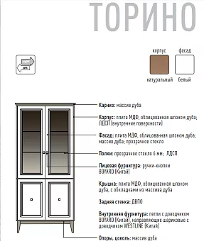 Фасад: МДФ, облицованный шпоном дуба, накладки из массива дуба, прозрачное стекло.