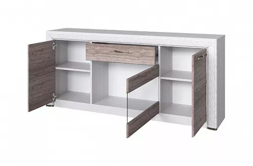 Тумба RTV 1V2D1S OLIVIA. Расширенный функционал – увеличенная ширина и высота – делает данную модель самостоятельным организатором ТВ-зоны в гостиной. При необходимости, с тумбой RTV 1V2D1S, можно сочетать другие элементы коллекции OLIVIA для создания комфортабельного помещения. Тумба RTV 1V2D1S имеет прямую конструкцию. Конструкция представляет собой одно отделение за витриной (1V), два отделения с полками ЛДСП за глухими дверями (2D), один выдвижной ящик (1S). Двери – распашные, крепятся на петли к боковому корпусу изделия.