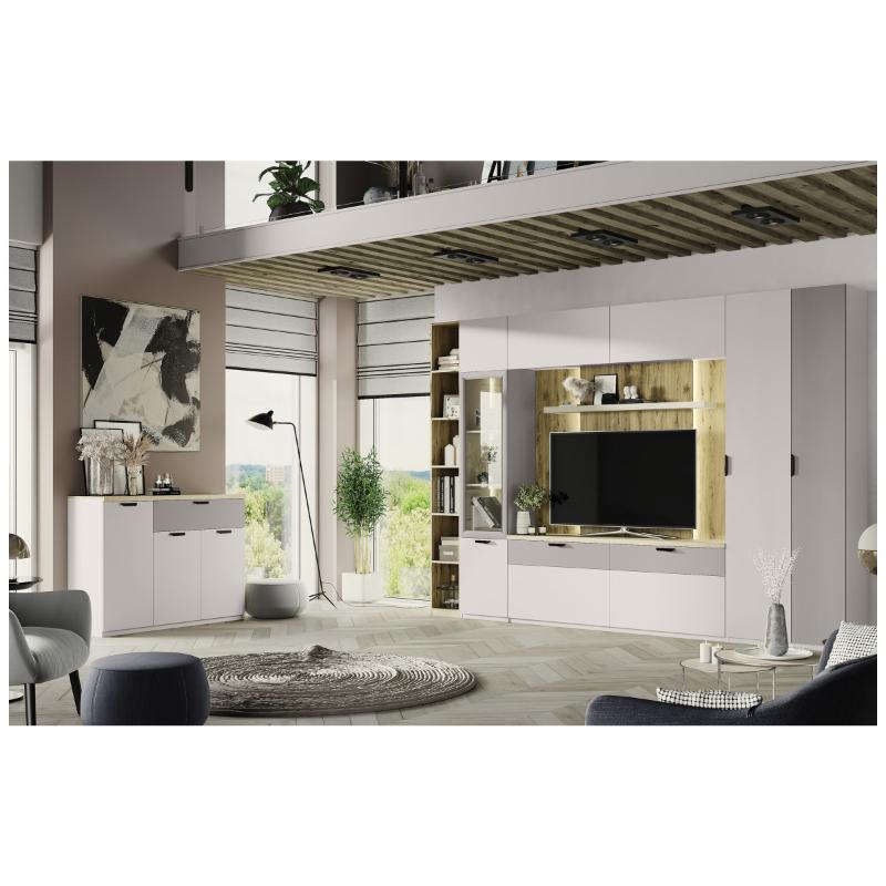 Тумба RTV 2D2S MODERN – комфортабельный и модный предмет мебели для создания интерьера гостиной, а именно, тв-зоны. Модель отличают практичность, модное сочетание текстур, большая поверхность верхнего щита для установки телевизора. Конструкция тумбы RTV 2D2S MODERN прямая, представляет два отделения за двумя глухими дверями (2D), два выдвижных ящика (2S). Двери откидные, крепятся на петли и газлифты к корпусу изделия. Оформит интересную и красивую центральную зону гостиной в комбинации с такими элементами коллекции MODERN, как шкаф 1D/87-40 (2 шт.), панель стеновая 175, полка консольная 130, а также, элементы шкафной группы глубиной 400 мм и высотой 2300 мм.