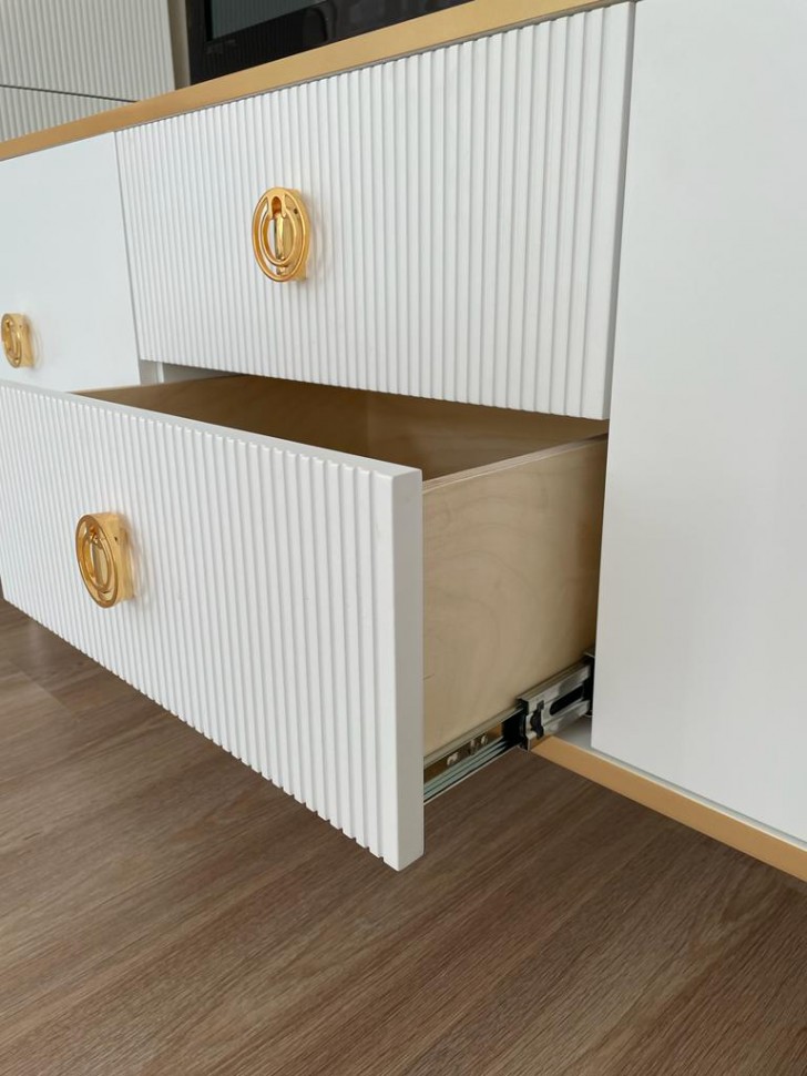 Тумба ТВ Глория 2 ящика + 2 двери выполнена из МДФ, в современном стиле. Крашения M11 (белый) и M18 (ваниль) с золотой или серебрянной патиной, но если патина серебро, то ручки только заказные за доплату. Шариковые направляющие BOYARD полного выдвижения, ящики из фанеры в лаке прозрачном. Дополнительно возможна установка с доводчиками. Ручки металлические. Возможно изготовление в нестандартном размере, подробности уточняйте у менеджеров.