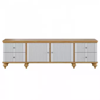Тумба ТВ оснащена четырьмя выдвижными ящиками и двумя полками за распашными дверями. Фурнитура на ящиках и дверях с доводчиками. Высокие ножки обеспечивают оптимальный доступ при уборке.