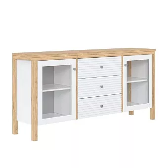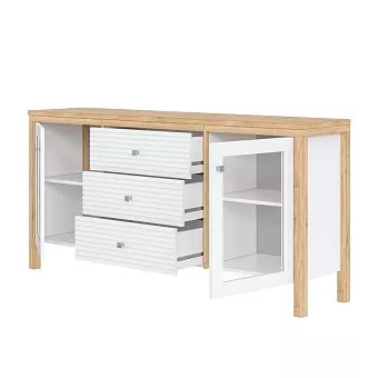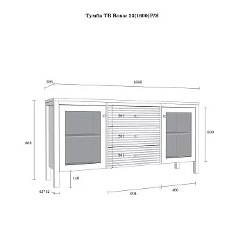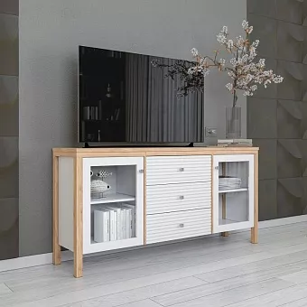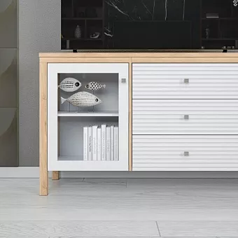 Тумба ТВ оснащена тремя выдвижными ящиками и двумя полками за распашными дверями. Фурнитура на дверях с доводчиками, на ящиках стоят телескопические направляющие полного выдвижения. Высокие ножки обеспечивают оптимальный доступ при уборке.
