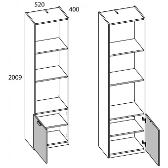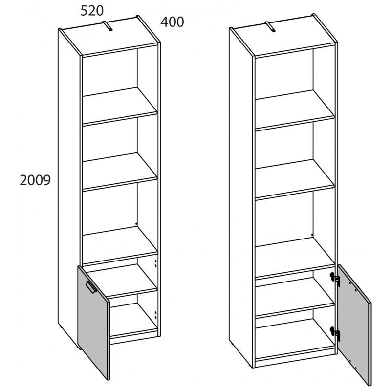 Шкаф открытый 1D/52 MODERN особенно будет необходим для организации молодёжной/детской комнаты за счёт открытых ниш и небольшой высоты. Но и установку в других по функционалу комнатах не исключаем – гостиная, прихожая, гардеробная зона. Конструкция шкафа открытого 1D/52 MODERN прямая, представляет открытое отделение с полками ЛДСП, одно отделение за глухой дверью (1D). Дверь распашная, крепится на петли к боковому корпусу изделия. Кодировка «52» обозначает ширину изделия.