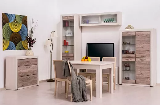 Материал: ЛДСП - 18 мм, МДФ - 25 мм - патинированные планки, закалённое стекло - 4 мм (витрина).
