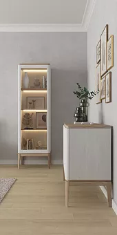 РУЧКА СПРАВА Производство витрин возможно в двух вариациях: со стеклянными полками или полками из МДФ. Возможна установка подсветки. В каталоге представлена коллекция корпусной мебели ICON’S. Отличительной чертой и особенностью коллекции можно считать преобладание светлых тонов, натуральность материалов, лаконичность и простоту. Корпус каждого изделия, верхняя крышка, полки и фасады изготовлены из МДФ и шпона дуба. Ящики выполнены из фанеры, основание каждого изделия производится из массива дуба. При создании коллекции ICON’S нами использовались такие лакокрасочные покрытия как эмаль, шелковисто-матовый лак и патина - Sayerlack (Италия). Для создания некоторых изделий применялся способ отделки дерева с помощью морения, в результате чего и был получен эффект морёного дуба в черном цвете. Вся фурнитура (петли, направляющие) с доводчиком бесшумного открывания/ закрывания от европейского производителя Hettich (Германия). Фасады оснащены интегрированными ручками. Простые линии, натуральные материалы и современный дизайн – это то, что сочетает в себе наша коллекция ICON’S. Элитная белорусская мебель от лучшего производителя страны.