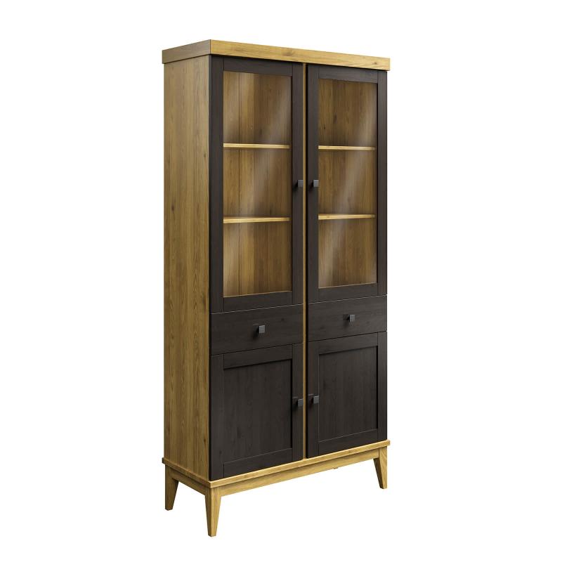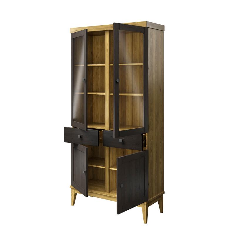 Представляем шкаф для посуды «Бон Вояж» 222 из массива сосны и стекла. Представляет собой высокий шкаф сверху двумя распашными, стеклянными дверями и снизу двумя филенчатыми дверками. В середине 2 выдвижных ящика.