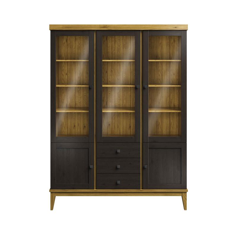 Представляем шкаф для посуды «Бон Вояж» 233 из массива сосны и стекла. Представляет собой высокий шкаф сверху тремя распашными, стеклянными дверями, снизу двумя филенчатыми дверками и тремя выдвижными ящиками.