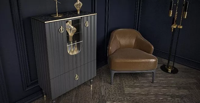 Коллекция мебели Лоренсо – это изысканный дизайн, подчеркнутый золотой металлической линией на изящной столешнице Мрамор Неро Маркина.