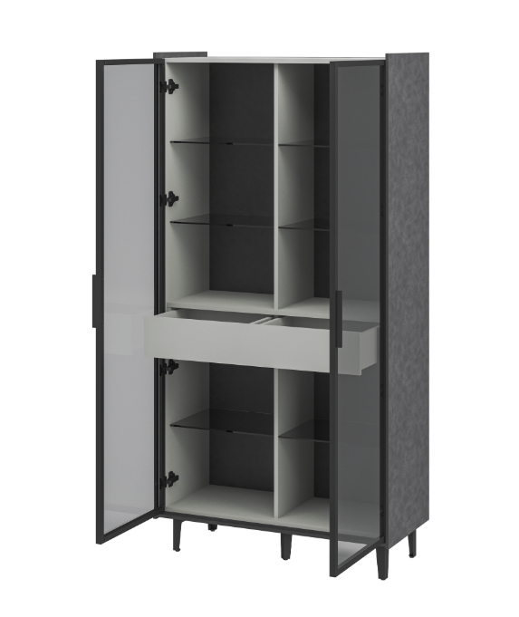 Витрина: стекло с тёмной тонировкой, алюминиевая рамка, профиль 20х20мм, цвет: черный брашированный.
