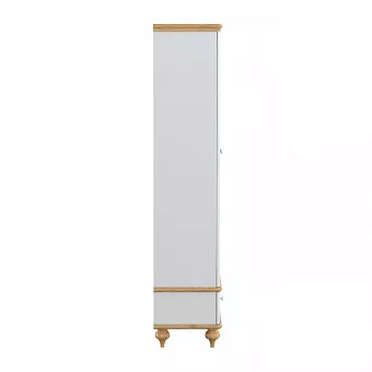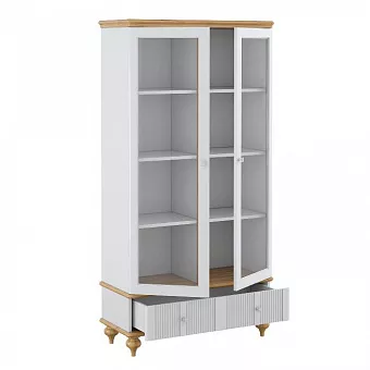 Витрина оснащена шестью полками за распашными, стеклянными дверями и одним широким ящиком. Фурнитура на дверях и ящике с доводчиками. Высокие ножки обеспечивают оптимальный доступ при уборке.