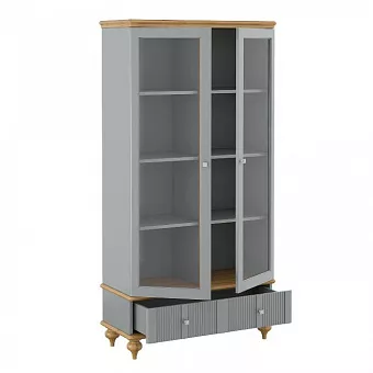 Витрина оснащена шестью полками за распашными, стеклянными дверями и одним широким ящиком. Фурнитура на дверях и ящике с доводчиками. Высокие ножки обеспечивают оптимальный доступ при уборке.