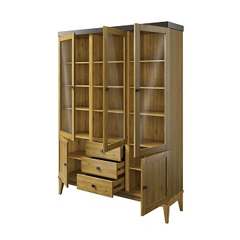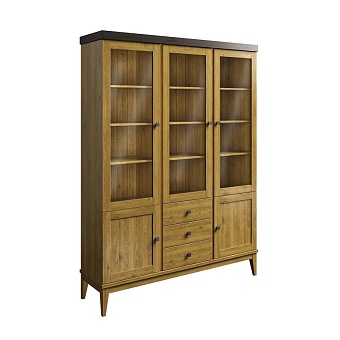 Представляем шкаф для посуды «Бон Вояж» 233 из массива сосны и стекла. Представляет собой высокий шкаф сверху тремя распашными, стеклянными дверями, снизу двумя филенчатыми дверками и тремя выдвижными ящиками.