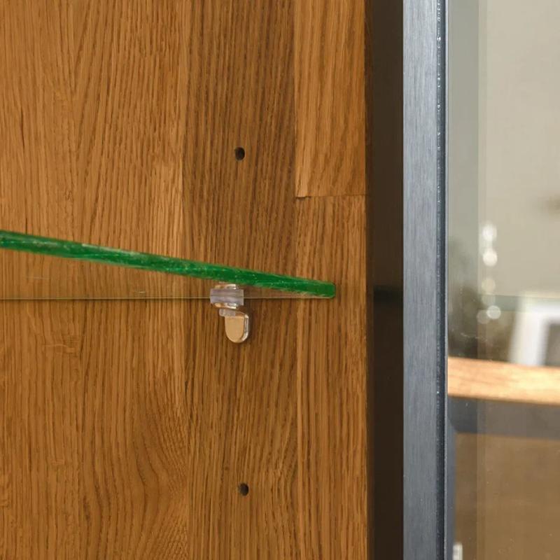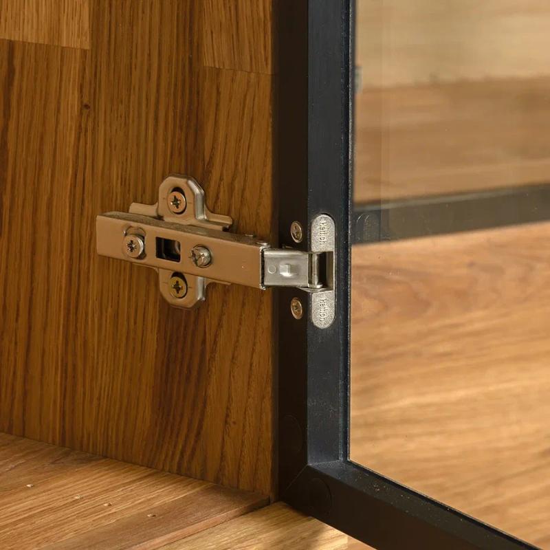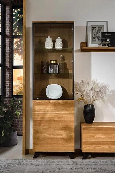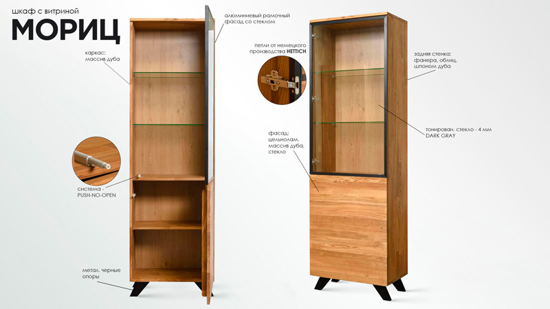 Коллекция Мориц изготовлена из массива дуба с алюминиевым рамочным фасадом с тонированным стеклом 4 мм. Опоры металлические черные. Серия хорошо впишется в гостиную, в скандинавском стиле. Каркас-массив дуб, фасад- массив дуб, стекло. Задняя стенка - фанера, облиц. шпоном дуба. Фурнитура: система Push-to-open Hettich/Blum, петли без доводчика Hettich. Вес изделия: 65 кг. Поставляется в собранном виде. Отделка: натуральное масло подчеркивающее естественный цвет дуба. Фотография на сайте может не передавать точный тон мебели.