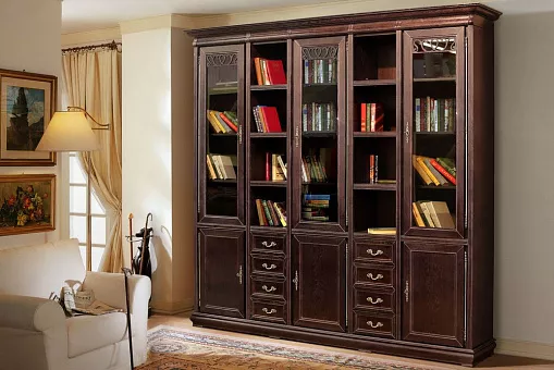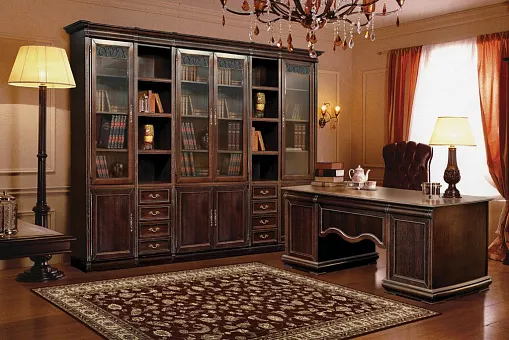 Набор для библиотеки – продолжение программы «Оскар». Те же изогнутые линии, искусные кружева, налёт старины на шкафах предназначенных для хранения книг, сувениров, альбомов и других дорогих для сердца вещей. Прекрасным дополнением идёт к шкафам письменный стол с широкой рабочей поверхностью, маня к себе многочисленными ящиками .