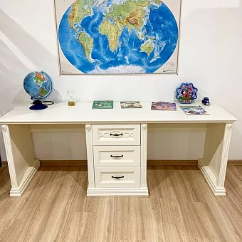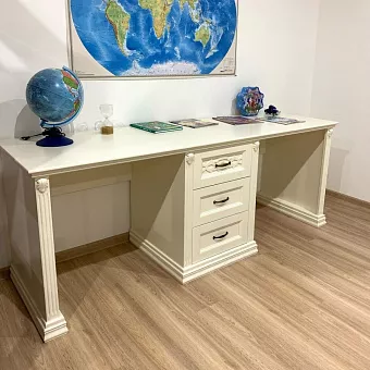 Письменный стол Верона выполнена из бук+МДФ, в классическом стиле. Стол Верона имеет тумбу с выдвижными ящиками. Направляющие на ящиках Boyard в базовой комплектации без доводчиков. Дополнительно возможна установка с доводчиками и патинирование элементов на фасаде. Ручки металлические. Возможно изготовление в нестандартном размере, подробности уточняйте у менеджеров.ширина тумбы 50 см / 67,4 рабочее место/ 5,4 нога/ свес 22 см